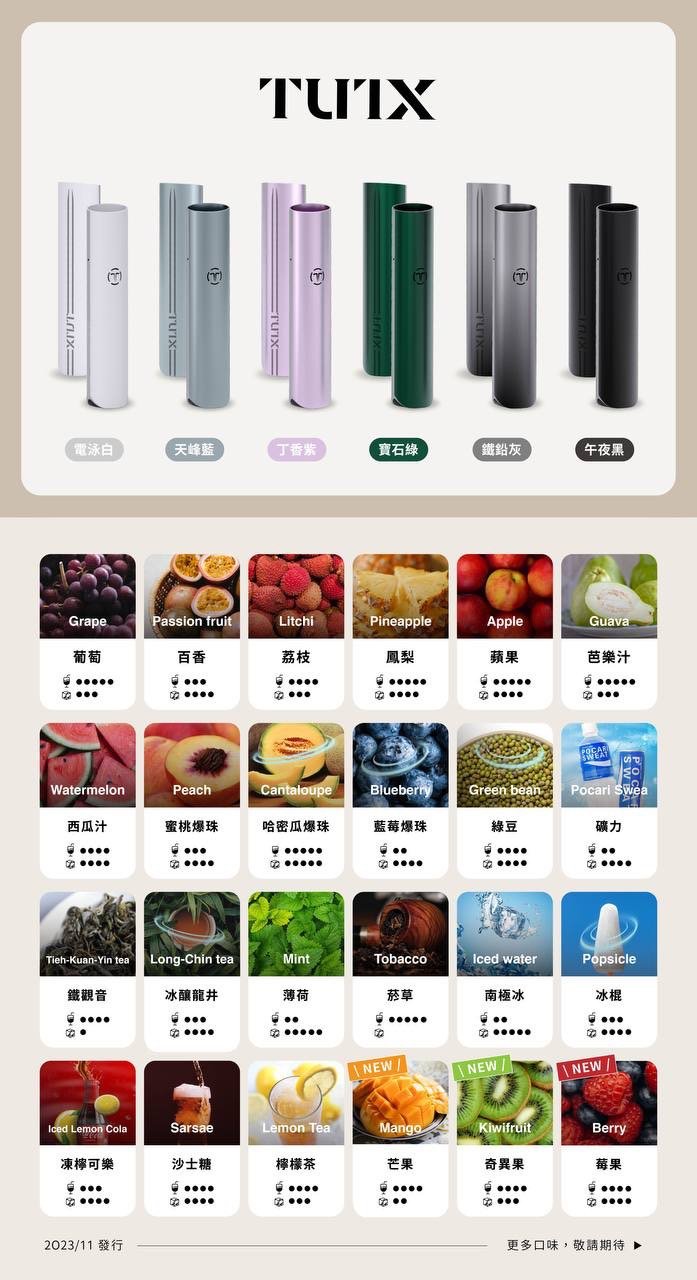 葡萄, 百香果, 荔枝, 鳳梨, 蘋果, 芭樂, 西瓜, 蜜桃爆珠, 蜜瓜爆珠, 藍莓爆珠, 綠豆, 礦力, 鐵觀音, 龍井, 薄荷, 菸草, 南極, 冰棍, 可樂, 沙士, 檸檬茶, 芒果, 冰梨, 奇異果, 莓果, 蔓越莓